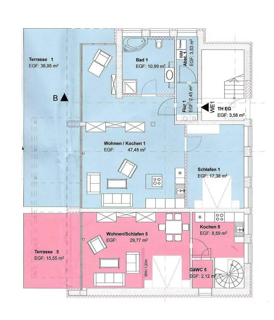 - Erdgeschoss/Souterrain (WE 5): Maisonette, 3 Zimmer, Küche, Gäste-WC, Bad, Ankleide, Terrasse (ca. 99,93 m²)
