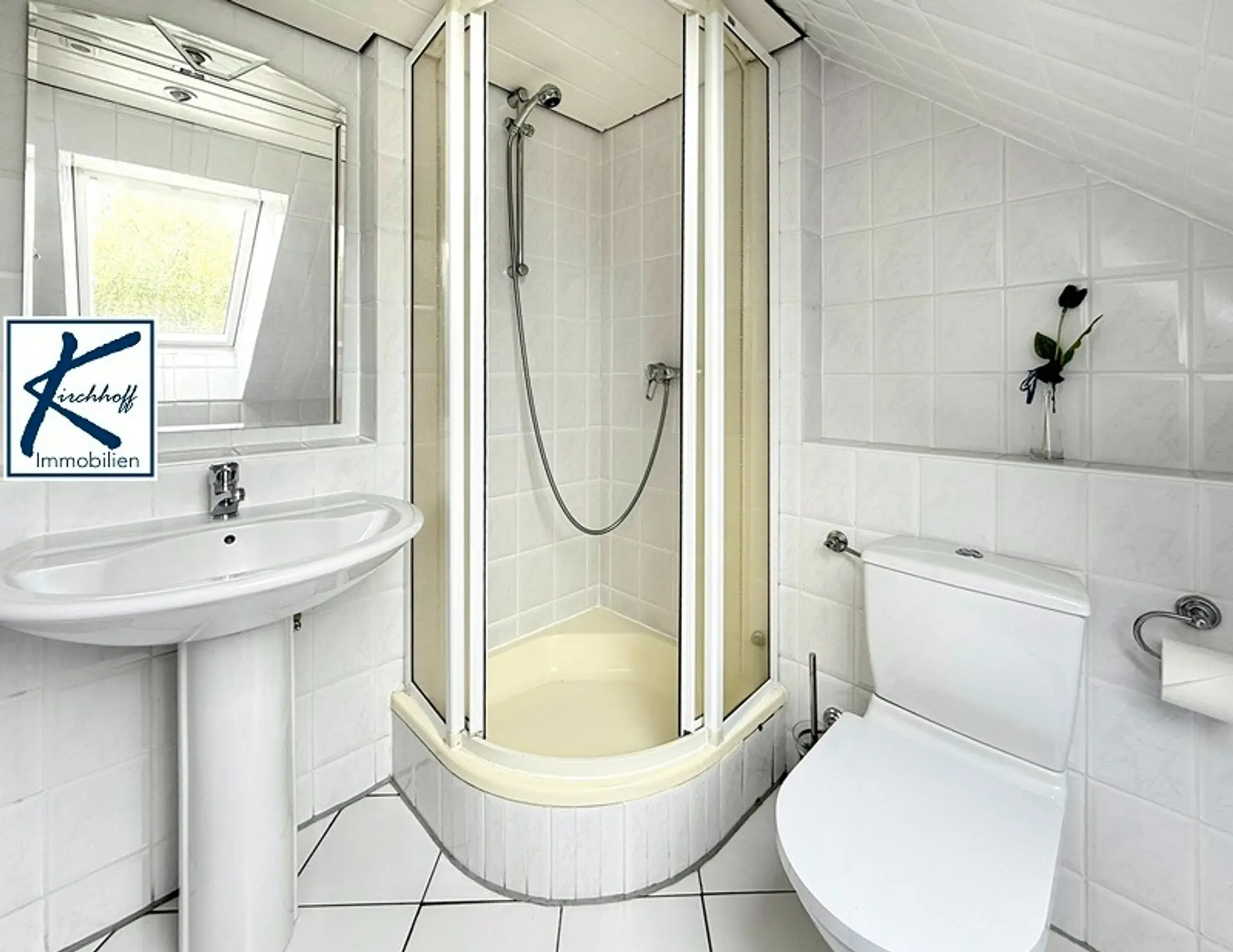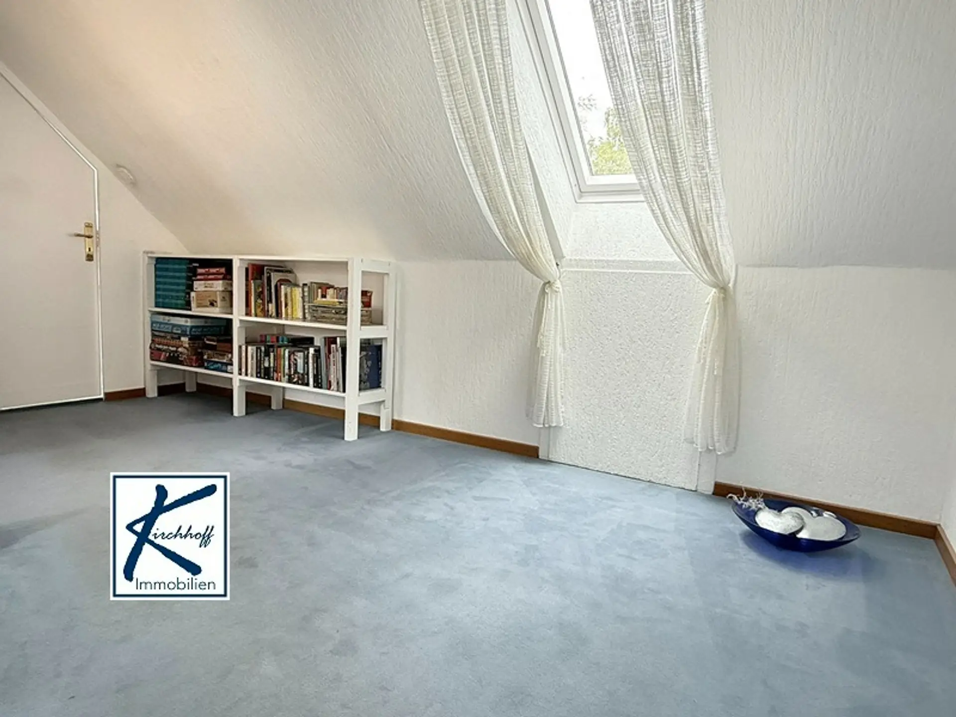 Im Dachgeschoss mit großer Diele finden sich zwei weitere helle Zimmer, die sich wunderbar als Kinder-, Gäste- oder Arbeitszimmer eignen. Ergänzt wird diese Etage durch ein drittes Badezimmer mit Dusche, Waschbecken und WC – eine seltene und sehr komfortable Ausstattung für Haushalte mit mehreren Personen.