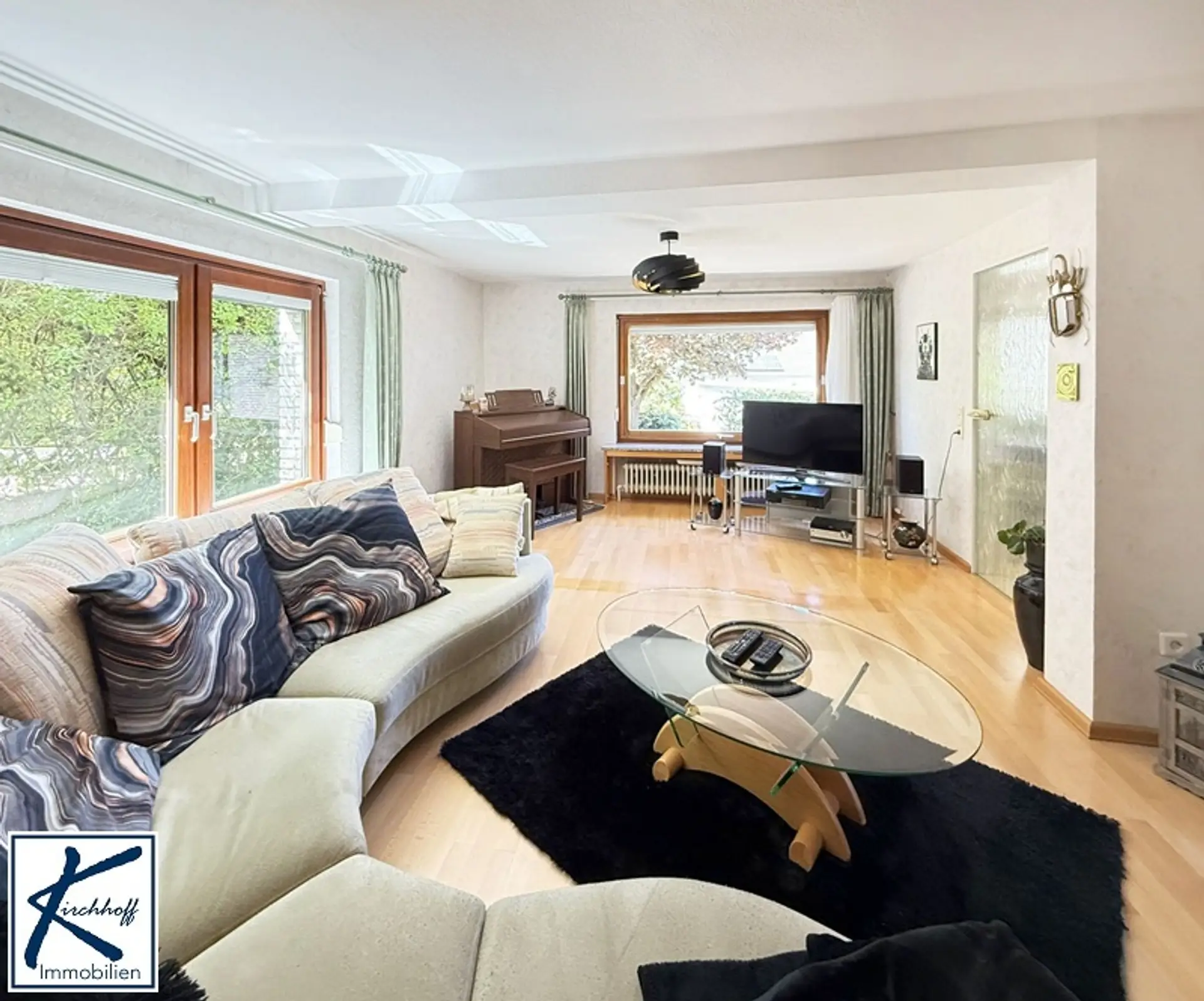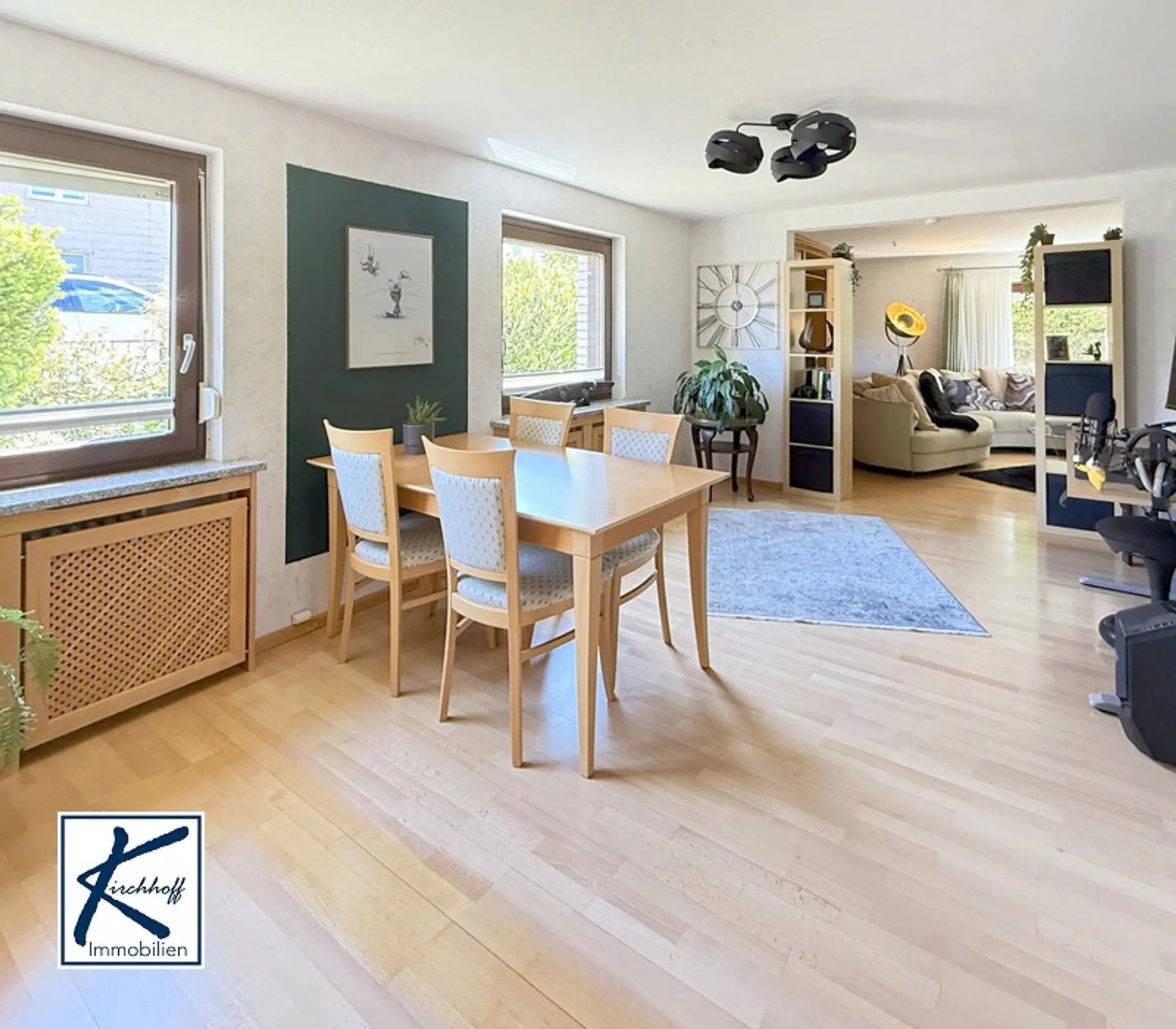 Rechts vom Windfang führt der Weg in das Treppenhaus und den Flur des Erdgeschosses. Die Küche liegt auf der rechten Seite des Flurs und ist mit einer hochwertigen Einbauküche ausgestattet, die im Haus verbleibt und im Kaufpreis inbegriffen ist. Durch eine Glastür betritt man das Wohnzimmer – ein heller Raum mit zwei großen Fenstern, der 1969 angebaut wurde. Hier lässt sich problemlos ein gemütlicher Wohnbereich mit Sofa, Sessel und persönlicher Note einrichten. Angrenzend befindet sich der Essbereich, der auch Platz für einen kleinen Arbeitsplatz oder eine Leseecke bietet – ein Ort für gemeinsame Mahlzeiten, Gespräche oder Rückzug.