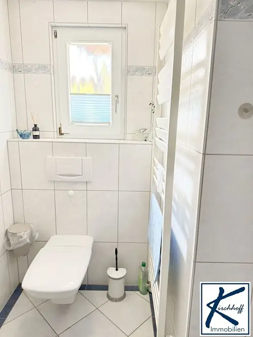 Nach dem Eintreten gelangt man zunächst in den Windfang, der vor dem eigentlichen Wohnbereich schützt und für eine klare Trennung zwischen Außen- und Innenraum sorgt. Gleich links befindet sich das Badezimmer mit Runddusche, Waschtisch, WC und Handtuchheizung – ein Tageslichtbad, das funktional ausgestattet ist und alles bietet, was man im Alltag braucht.