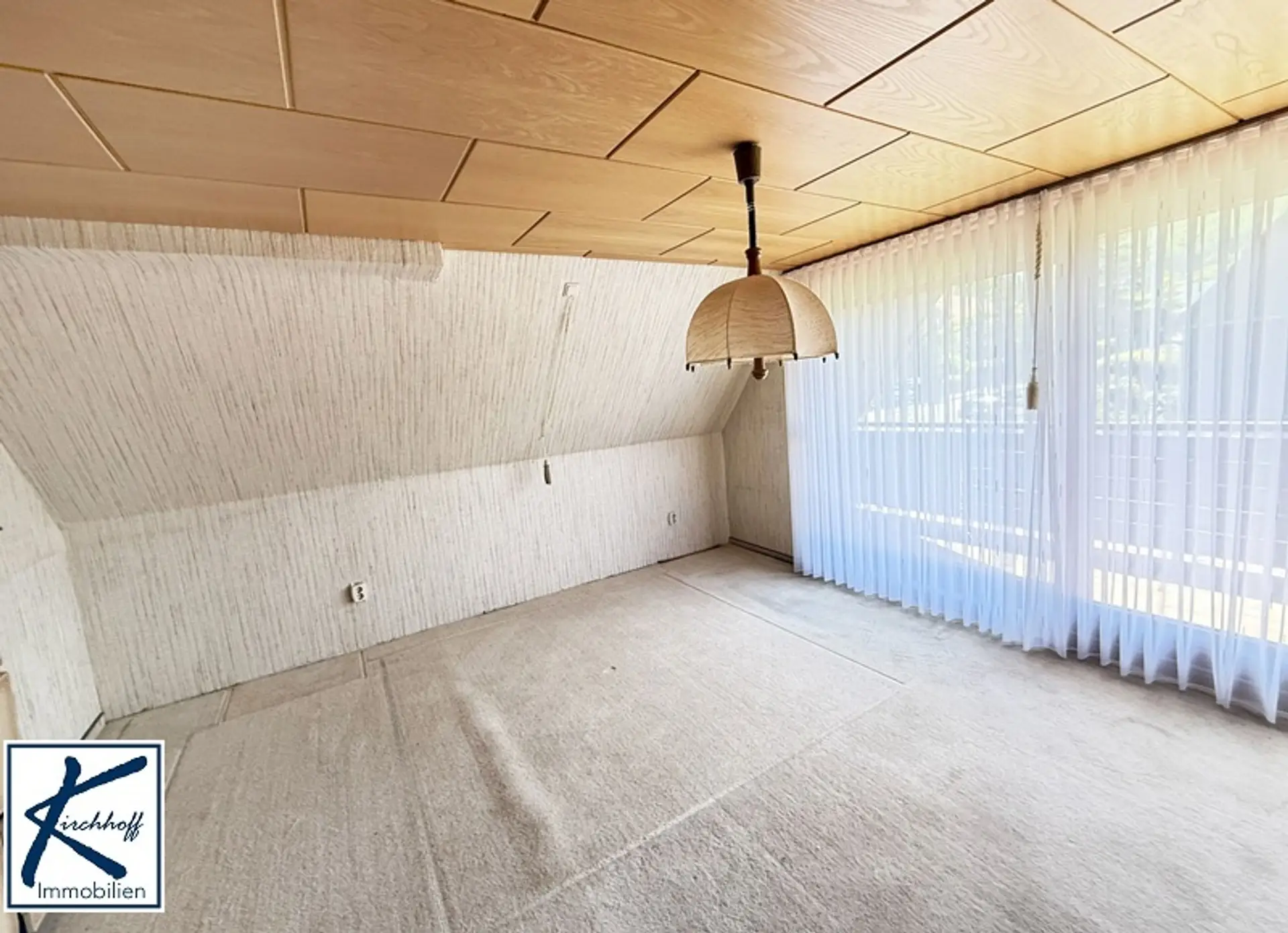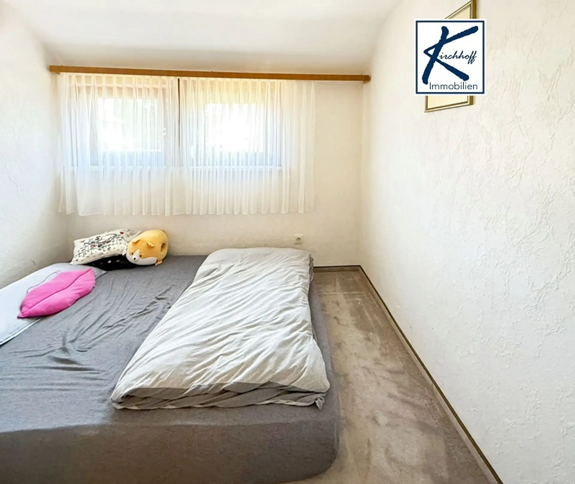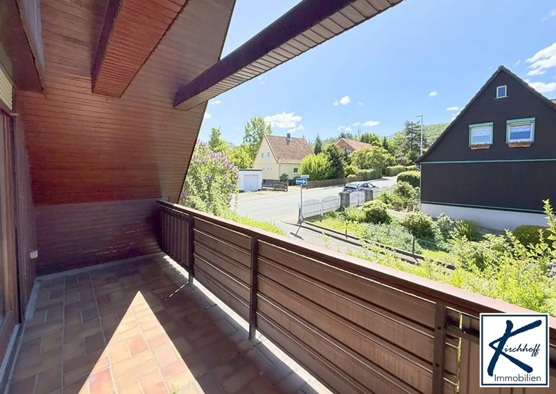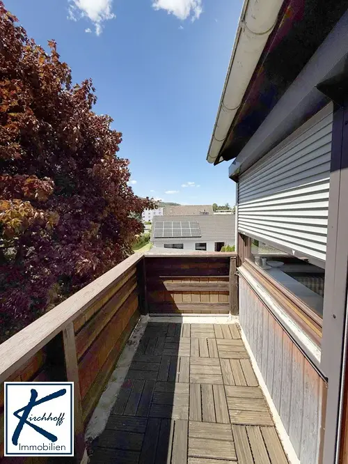 Über eine Holztreppe gelangt man ins Dachgeschoss. Direkt neben der Treppe liegt ein kleines Zimmer, das flexibel als Kinder-, Gäste- oder Arbeitszimmer genutzt werden kann. Daneben befindet sich ein größerer Raum, der von den bisherigen Eigentümern als Schlafzimmer genutzt wurde. Dieser Raum überzeugt durch seine klare Struktur, einen praktischen Einbauschrank sowie einen durch eine Tür abgetrennten Abstellbereich, der sich harmonisch in die Dachschräge einfügt – ideal zur Aufbewahrung von Kleidung, Koffern oder anderen Gegenständen. Von diesem Raum aus gelangt man auf die Loggia, die zum Durchatmen, Lesen oder einfach zum Blick in den Garten einlädt. Selbstverständlich kann der Raum auch anders genutzt werden – beispielsweise als Hobbyraum, Homeoffice oder zweites Wohnzimmer. Ein weiteres Zimmer im Dachgeschoss, das ebenfalls zur ruhigen Gartenseite liegt, eignet sich sehr gut als separates Schlafzimmer. Es verfügt über einen eigenen Balkon mit schönem Ausblick.