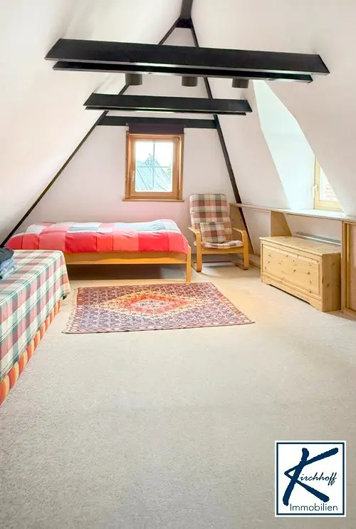 Das Dachgeschoss beherbergt ein großzügiges Zimmer, das sich gut als Kinder- oder Jugendzimmer eignet. Durch die Größe und den Zuschnitt des Raumes ist eine flexible Möblierung möglich – beispielsweise mit Bett, Schreibtisch, Regal- oder Spielelementen. Die Dachschrägen verleihen dem Raum eine angenehme Atmosphäre, ohne die Nutzbarkeit einzuschränken. Angrenzend befindet sich ein innenliegendes Bad, das mit einer Dusche, einem WC und einem Waschbecken ausgestattet ist. Es ist funktional gestaltet und ermöglicht eine unabhängige Nutzung des Dachgeschosses – ideal für Kinder im Jugendalter, Gäste oder als separater Arbeitsbereich mit eigenem Sanitäranschluss. Die Kombination aus Wohn- und Sanitärbereich im Dachgeschoss erweitert die Nutzungsmöglichkeiten des Hauses deutlich und schafft zusätzliche Flexibilität im Alltag.