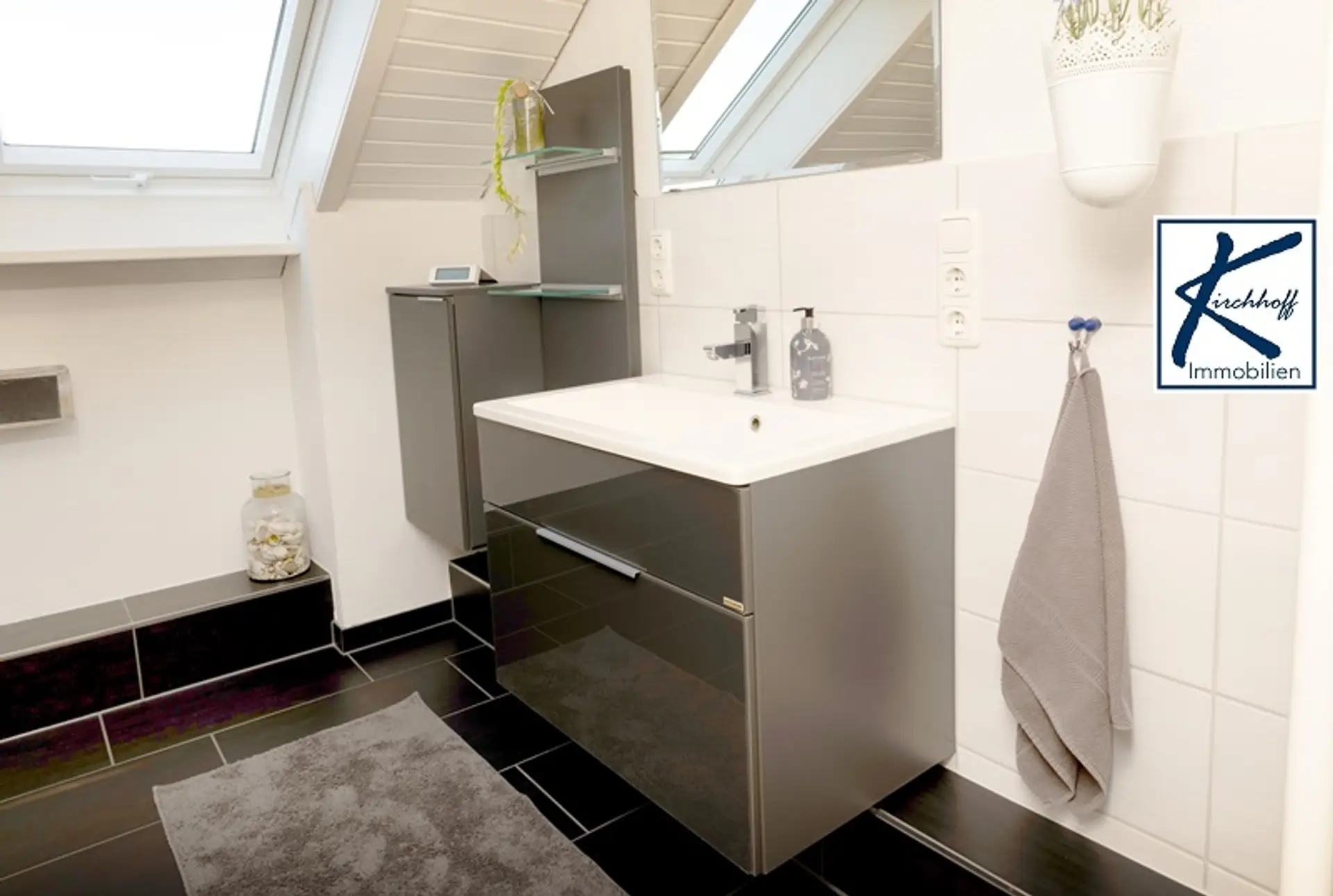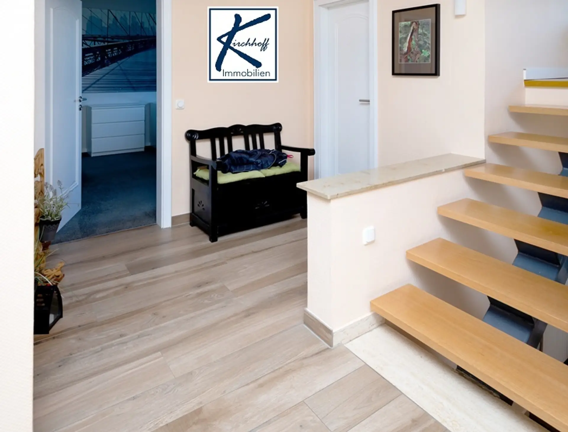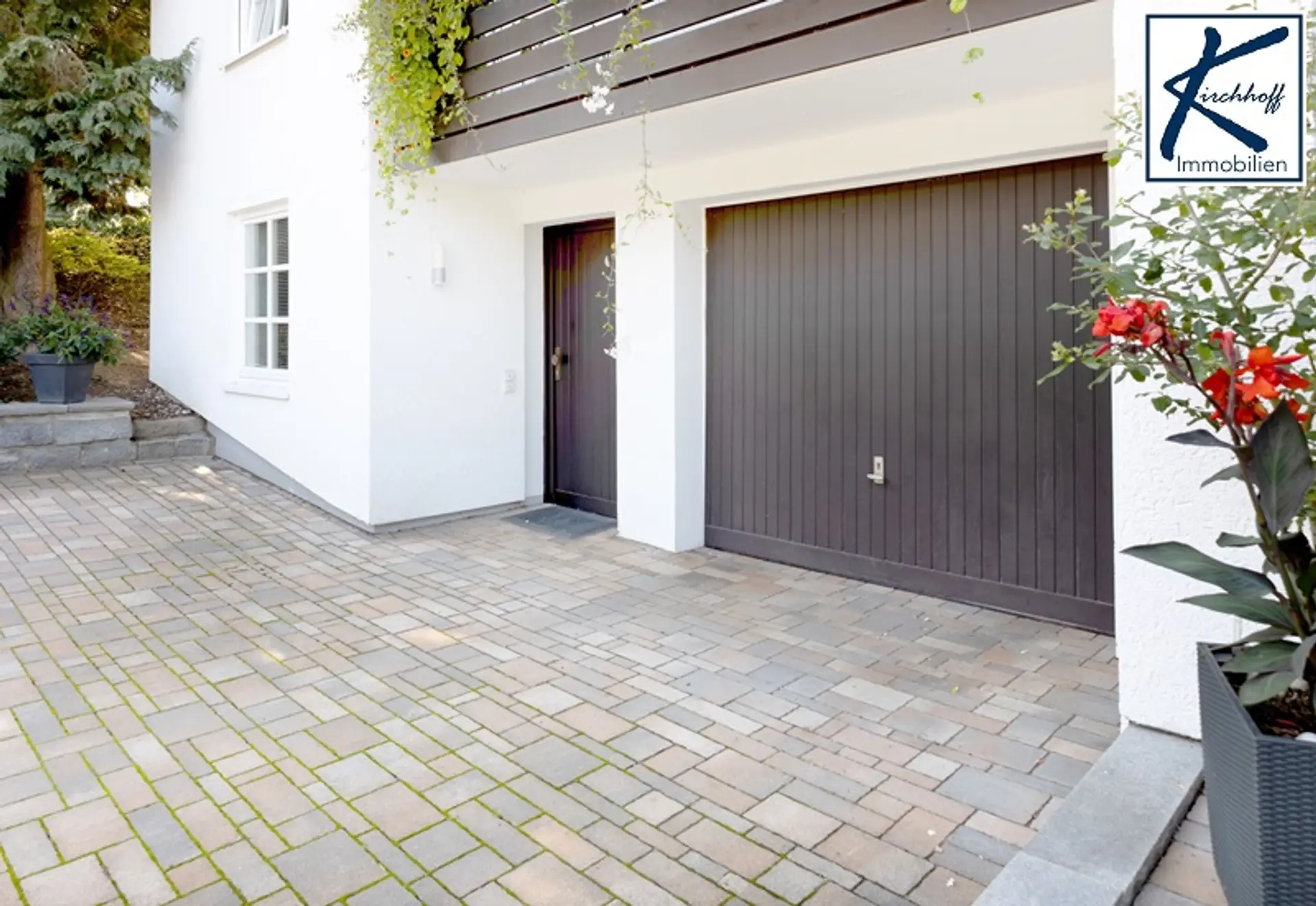 Der einladende Hauseingang führt über eine Treppe in den Windfang, die in das Erdgeschoss übergeht. Hier empfängt Sie eine großzügige Diele, die durch eine zweiflügelige Glastür zur Küche und zum lichtdurchfluteten Wohn- und Essbereich führt. Die angrenzende Küche ist mit einer modernen Einbauküche ausgestattet, die im Kaufpreis enthalten ist und Ihnen viel Stauraum und Komfort bietet. Das geräumige Wohnzimmer mit einer eleganten Glas-Schiebetür schafft eine harmonische Verbindung zwischen Küche und Wohn- und Essbereich. Hier ist Platz für einen großen Esstisch und eine gemütliche Wohnlandschaft. Durch mehrere Terrassentüren gelangen Sie auf die Terrassen und in den gepflegten, terrassenförmig angelegten Garten, der zum Entspannen einlädt. Auch die Küche bietet einen Zugang zur Terrasse, der teilweise überdacht ist und Ihnen ermöglicht, bei jedem Wetter den Außenbereich zu genießen. Von der Diele aus führt ein Flur zu den privaten Räumen des Erdgeschosses. Hier finden Sie ein gemütliches Schlafzimmer und ein großes, luxuriöses Badezimmer mit freistehender Badewanne, bodentiefer Dusche, großem Waschtisch, separiertem WC und einer Handtuchheizung. Praktisch ist auch der Hauswirtschaftsraum, der direkt vom Flur aus zugänglich ist. Rechts von der Diele liegt ein weiteres Zimmer, das sich hervorragend als Arbeitszimmer, Gästezimmer oder Kinderzimmer eignet. Ein stilvolles Gäste-WC vervollständigt die Annehmlichkeiten auf dieser Etage.