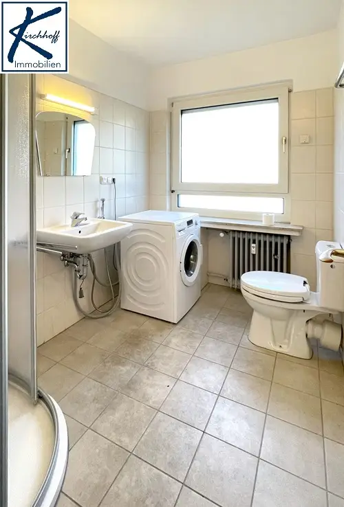 Erneuertes Badezimmer: Das Badezimmer wurde 2018 modernisiert und überzeugt mit modernen Fliesen, einer bodentiefen Dusche, einem Waschbecken und einem WC. Das Fenster sorgt für Tageslicht und eine gute Belüftung.